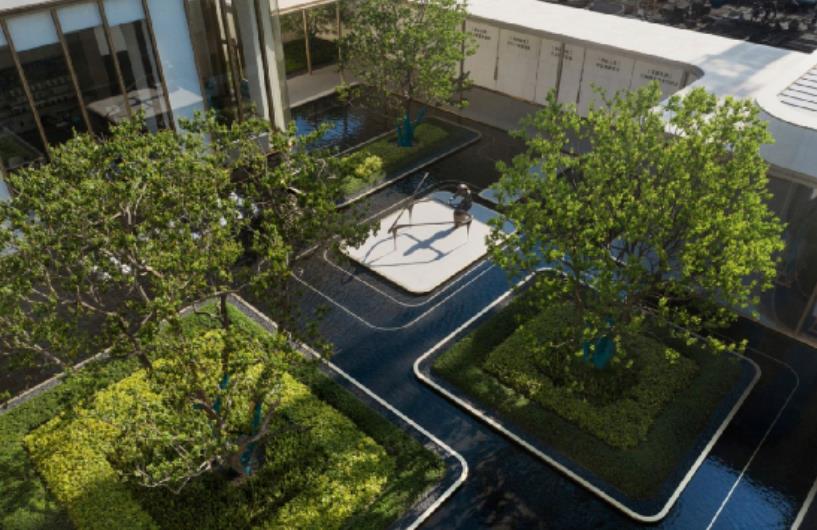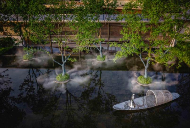 之后我們見到的又是另一種形態(tài)的水,板巖平鋪?zhàn)龅?,出水則側(cè)鋪三角幾何微地形并種植單桿烏桕林,這便是山水林的縮影,頗有江南美景細(xì)水流長的意味,將歸家者從快節(jié)奏的都市生活中一下子拉進(jìn)江南水鄉(xiāng)的愜意中,營造出一種禪境,置身其中的人感悟有所相同又有所不同,歸于安寧。
