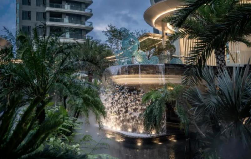 ???? 瀑布從將近5米的空中奔流而下,匯于郁郁蔥蔥的熱帶雨林下沉庭院,形成的溪流,穿梭于熱帶風(fēng)情的綠化之中。瀑布掩映在高低錯落的熱帶種植中,彎桿銀海棗、美麗針葵、圓葉軸櫚、彩虹鳥蕉、箭羽竹芋、青蓮竹芋等植物將此區(qū)域渲染出了濃郁的熱帶風(fēng)光。結(jié)合柔和的燈光,水霧,將人帶入了仙境。整個下沉花園煥發(fā)出勃勃生機(jī),體現(xiàn)世界的面貌以及人類與大自然曾經(jīng)的zui原始的關(guān)系。