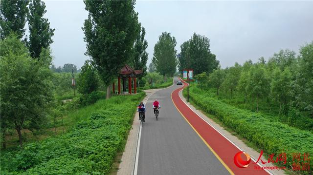 近日,當?shù)鼐用裨诤颖笔婵h運河堤頂觀光路上騎行。 人民網(wǎng) 袁志廣攝