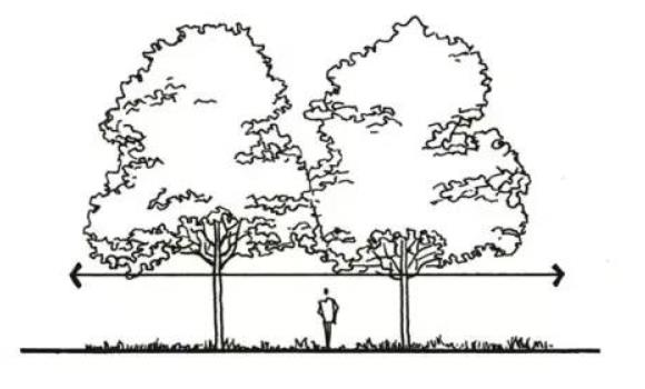 覆蓋空間一般是指冠大蔭濃的大喬木或攀援植物覆蓋的花架、拱門等,構(gòu)成頂部覆蓋、四周開敞的下部活動(dòng)空間。這類空間比較涼爽,視線通透,下部只有樹干,活動(dòng)空間較大,遮蔭效果好。多用于林蔭道、花架等綠化。
