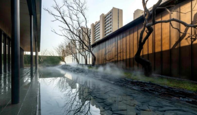之后我們見到的又是另一種形態(tài)的水,板巖平鋪?zhàn)龅?,出水則側(cè)鋪三角幾何微地形并種植單桿烏桕林,這便是山水林的縮影,頗有江南美景細(xì)水流長的意味,將歸家者從快節(jié)奏的都市生活中一下子拉進(jìn)江南水鄉(xiāng)的愜意中,營造出一種禪境,置身其中的人感悟有所相同又有所不同,歸于安寧。